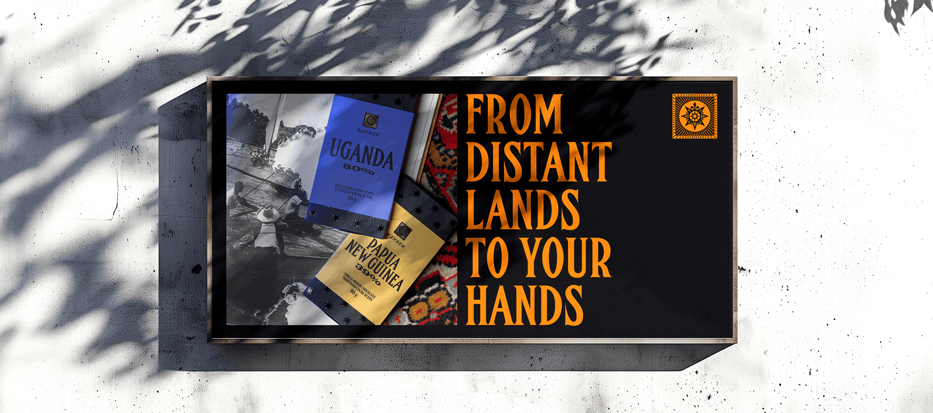 Wander is a premium handmade chocolate brand rooted in the idea of travel and discovery. Created by adventurous founders, the brand celebrates single-origin flavours and rare ingredients sourced from around the world. We developed the name, visual identity, and packaging to reflect the sensory and emotional richness of that journey.